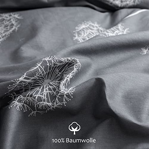 Bettwäsche 155×220 Baumwolle für Winter bis Sommer Grau Weiß Wendebettwäsche Pusteblume Muster 100% Baumwolle Soft Touch mit Reißverschluss 2teilig Set