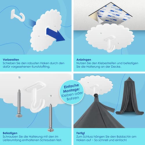 𝐒𝐂𝐇𝐍𝐄𝐋𝐋 𝐌𝐎𝐍𝐓𝐈𝐄𝐑𝐓: Durch die einfache und unkomplizierte Montage ist der Baldachin in wenigen Schritten Einsatzbereit. Befestigen Sie dazu den Haken am Kunststoffring – im Anschluss versehen Sie den Kunststoffring mit den Klebestreifen und befestigen Sie die Halterung an der Decke. Schrauben Sie die Halterung mit den im Lieferumfang enthaltenen Schrauben fest. Zum Schluss den Baldachin einfach an dem Haken aufhängen – so einfach!