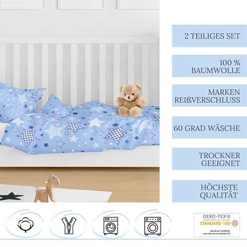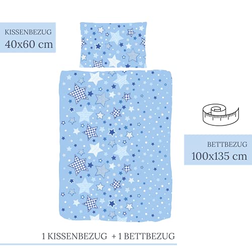Sterne Fein Biber Baby & Kinder Jungen Bettwäsche, Stars Sterne & Sternchen blau, himmelblau – 2-teilig Kissenbezug 40×60 + Bettbezug 100×135 cm – 100 % Baumwolle